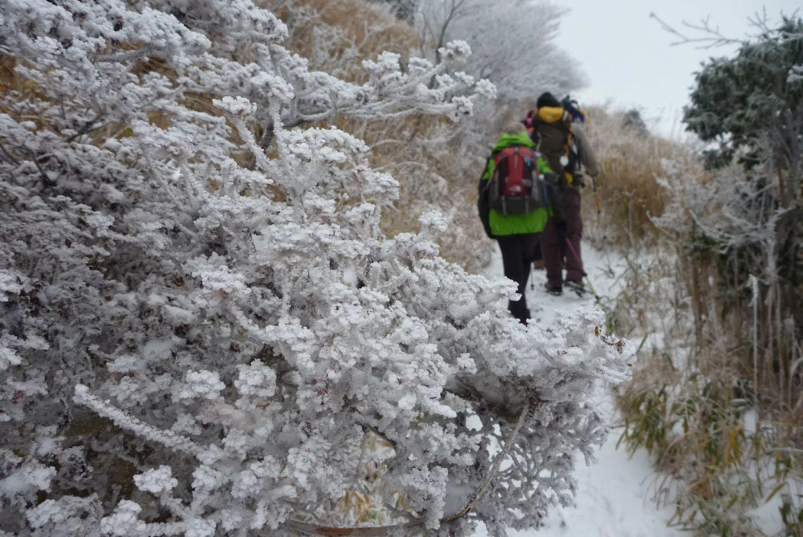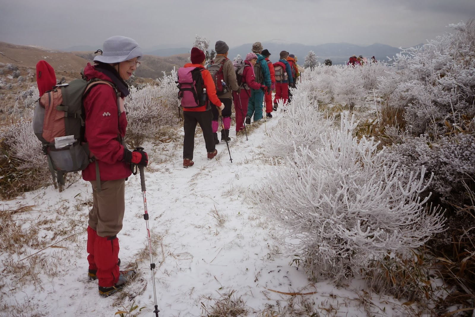 由布岳と涌蓋山 九州 2011.12.132018.05.25 2011年の忘年登山は由布岳と涌蓋山 大阪からフェリーで往復です。 まずは由布岳 寒波で寒いですが、皆さんの装備は完璧! 準備体操して出ましょう ガイドは鈴木さん 今回沖本はガイドでも添乗員でもなくサブとして歩きます 曇り空でちょっと寒々しい コンディション厳しくなってきました やはり途中で撤退 風強く、バーンになっています。仕方ない。 無事下山です その後、鶴見岳のパーティーと合流し、宿へ 恒例のビンゴ大会です!盛り上がりました! 翌朝 宿の前の道も真っ白 筋湯へ移動して涌蓋山へ 雪はありますが、なだらかな山なので問題ないでしょう! 今日は三浦ガイド 巧みな話術で惹きつけます 霧氷がキレイ 残念ながら山頂は雲の中 しかし、帰路は雪がきれいでした 無事下山! 筋湯で入浴して帰りました。 九州だから雪が少ないと思い参加していただいたお客様ごめんなさいです。 来週も由布岳ですが・・・。 雪なくなってるといいなぁ