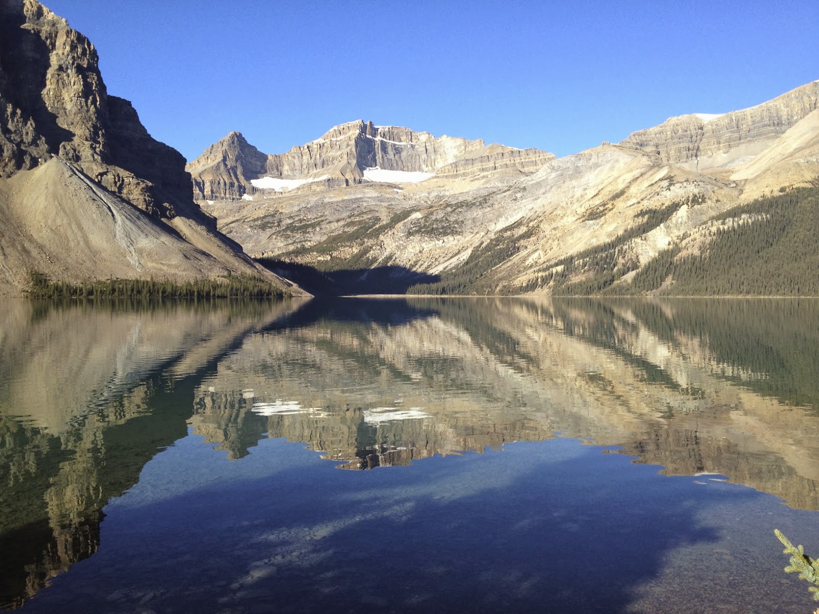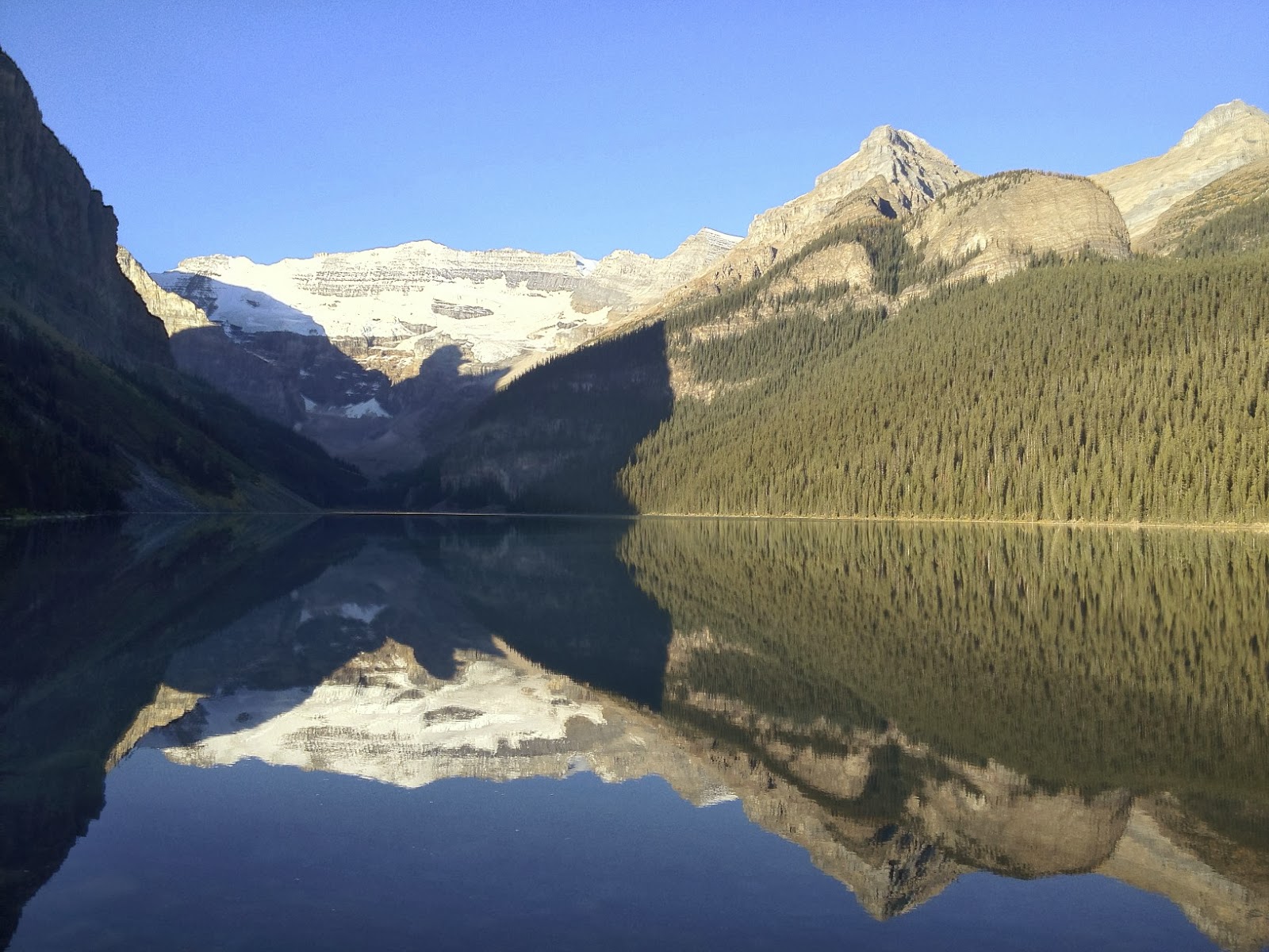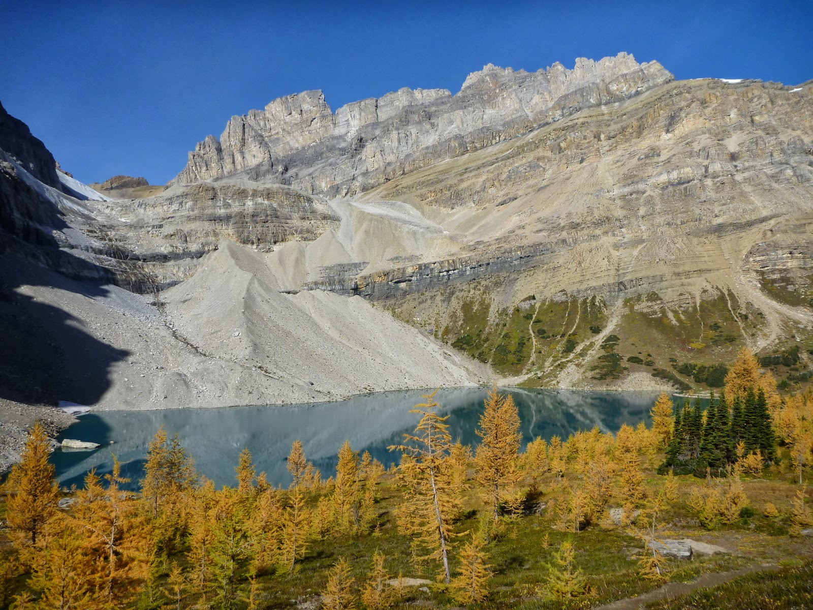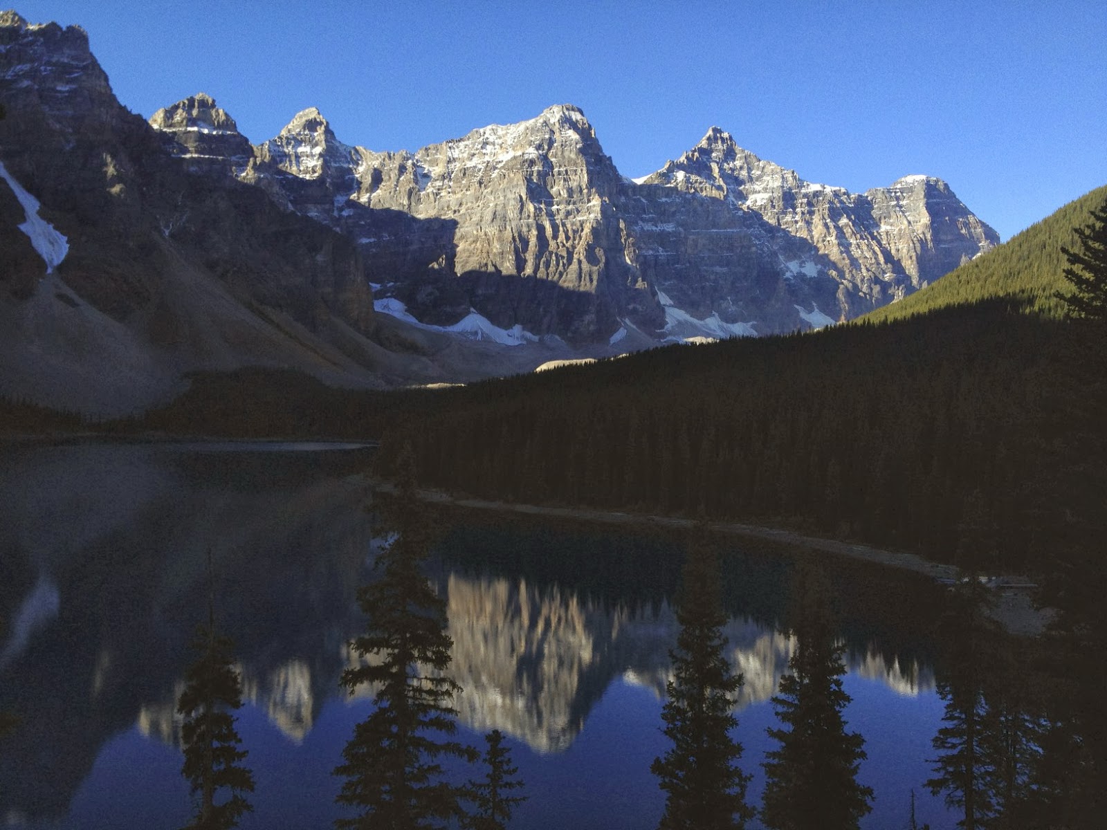 まずはバンフへ入ります。時差ぼけの影響もあるので、ラーチバレーで足馴らしのハイキング。秋なのでモレーンレイクには日が差し込んでいませんでしたが、テンピークスの山々が美しく映り込んでいました。