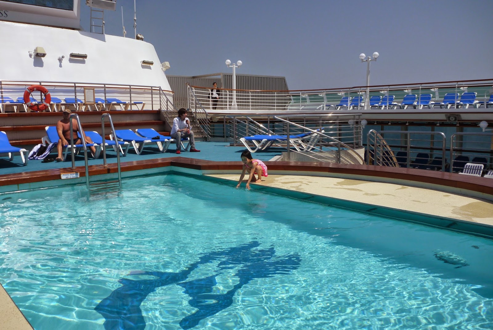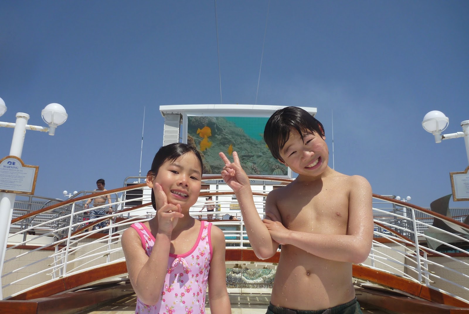 まだ4月で寒いのに、船のプールで遊ぶ数名の子供たち(^^)