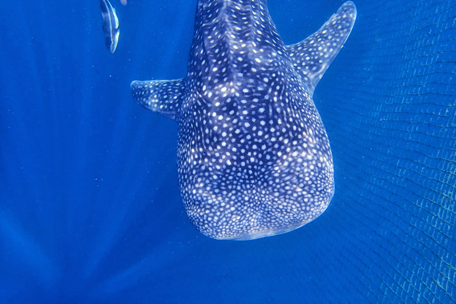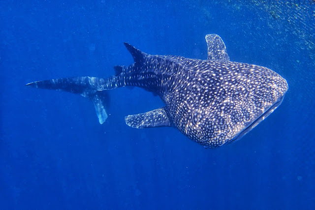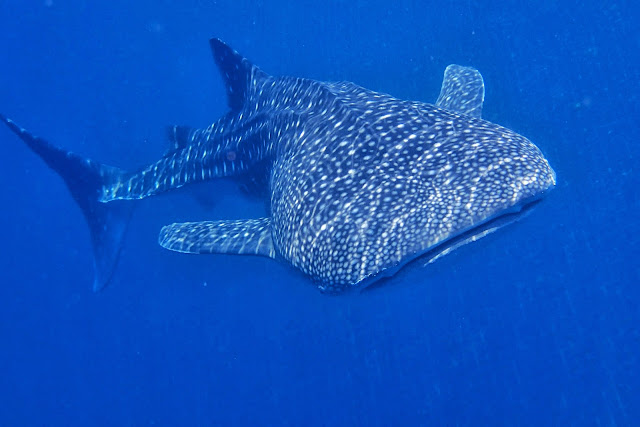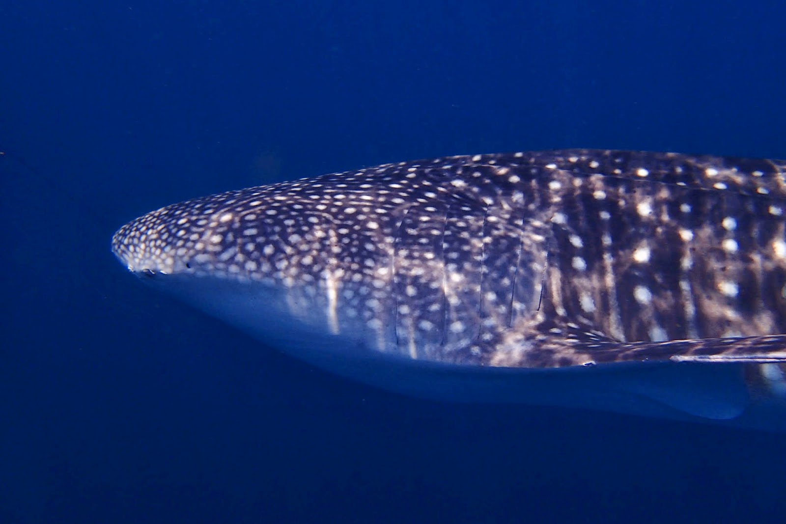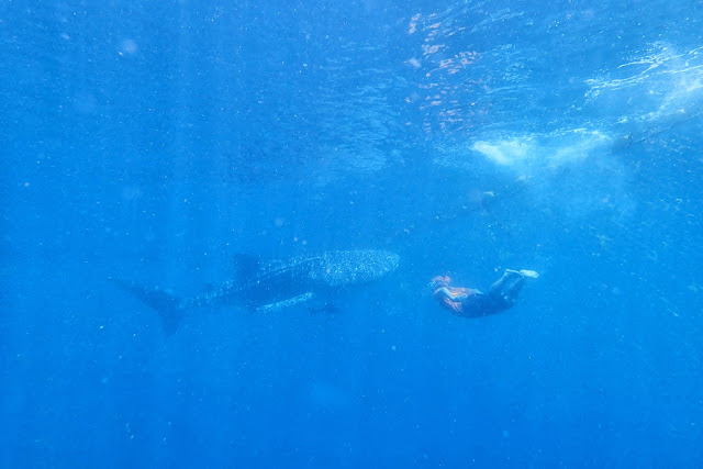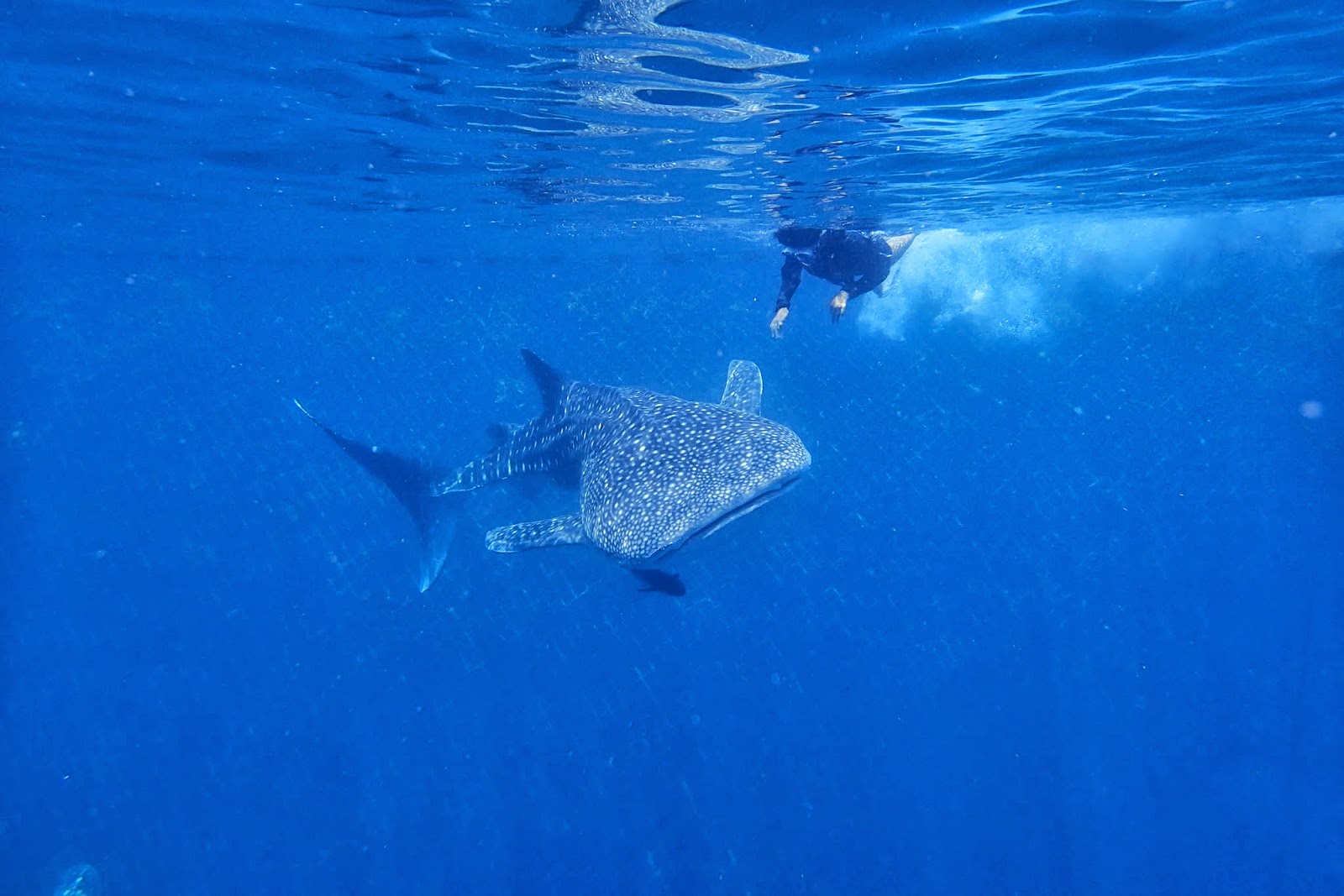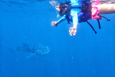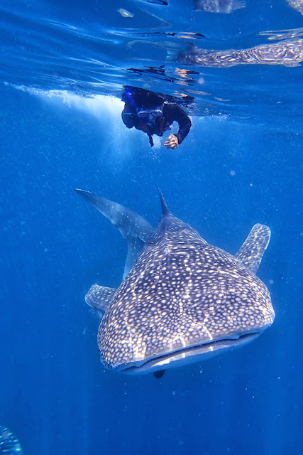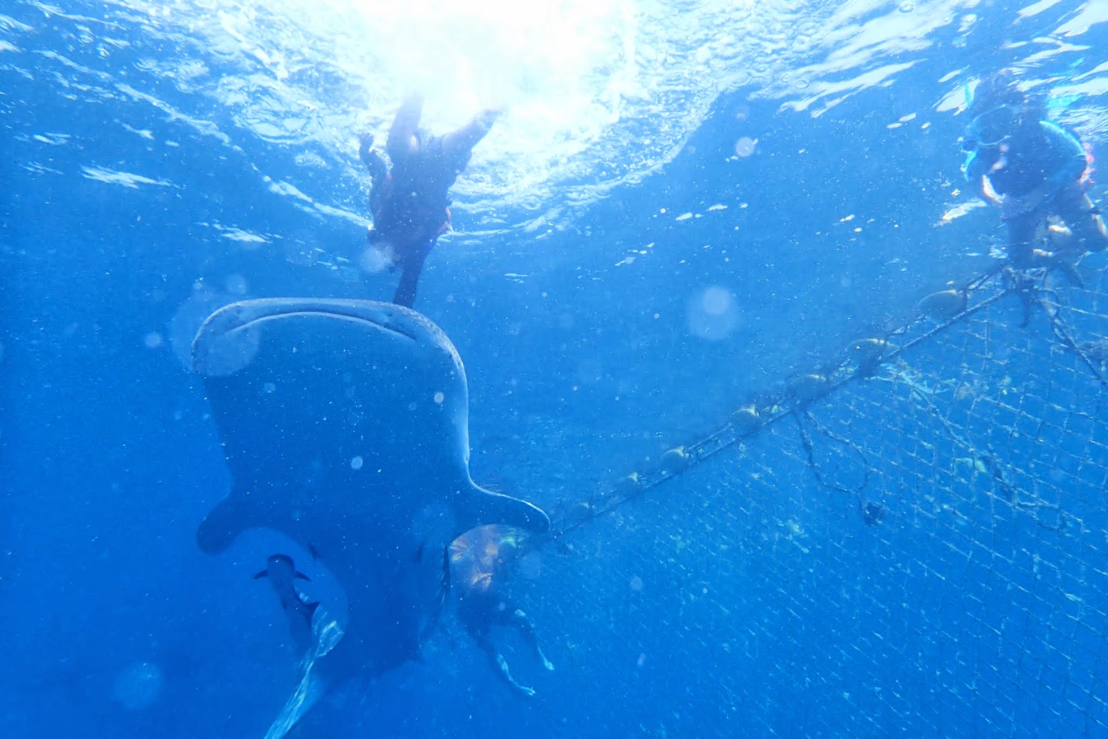絶対に、シュノーケリングがお勧めです!だってジンベイは水深4mくらいまで をぐるぐる。スーツも着ないで身軽に一緒に泳ぐ方が楽しいです!ボンベを背負うと重すぎます。今回は私達の他に2名ダイバーがいましたが、私達のほうがずぅ~っと楽しめていました。途中からタンク外して泳いでいたくらいですから。