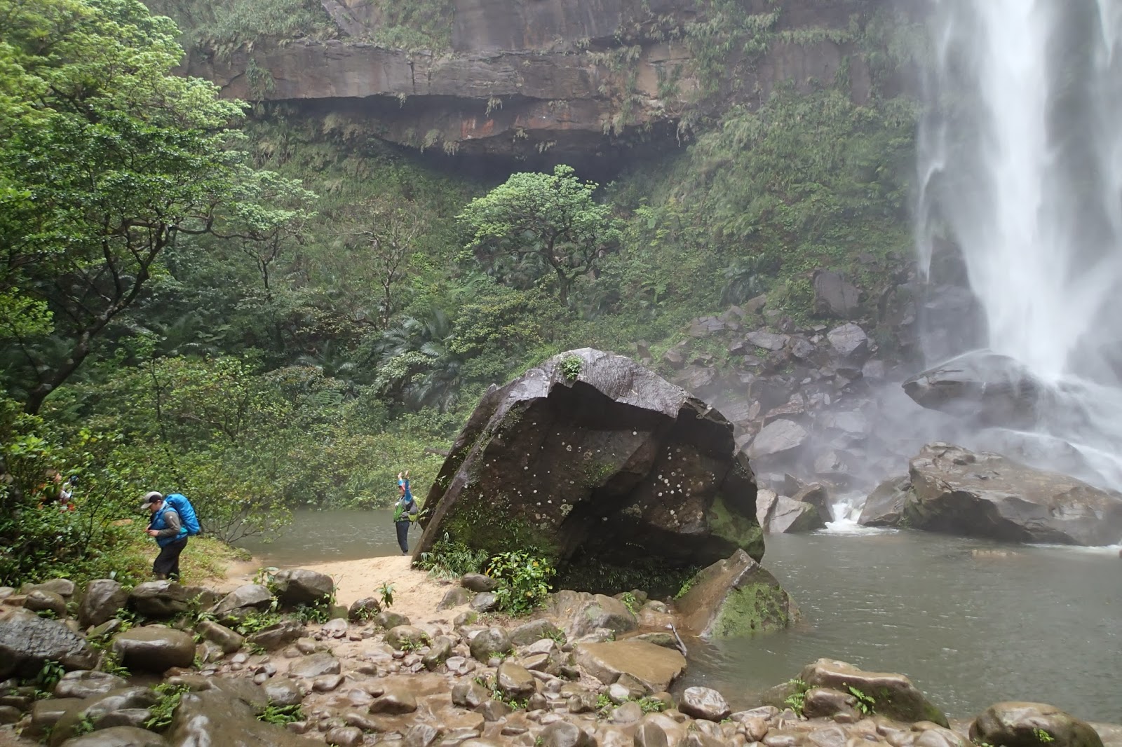 でも、この水量じゃ滝上に出るのにこの川を渡るのは時間もかかり、危険と判断。