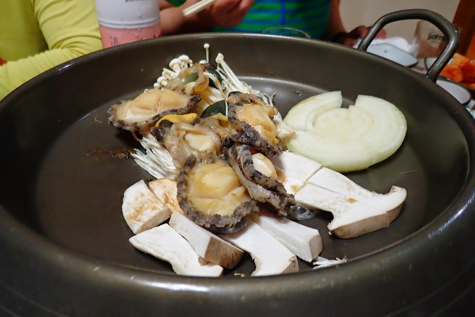 下山後は、アワビの刺身、バター焼き、しゃぶしゃぶ等