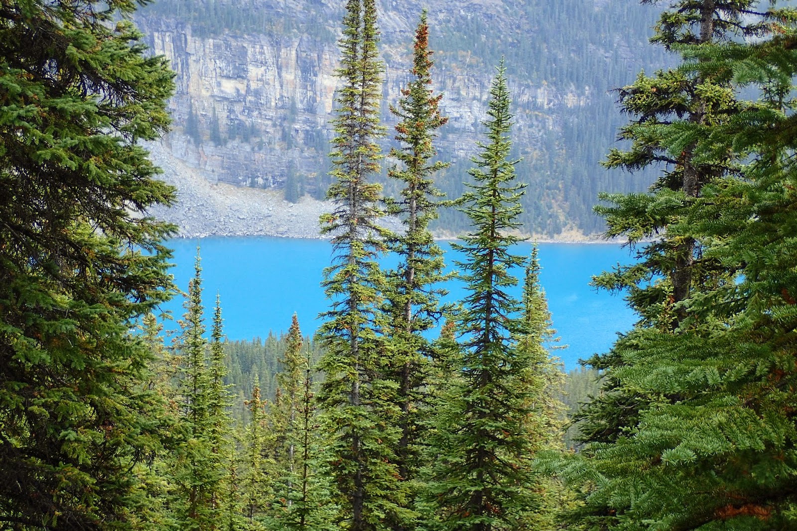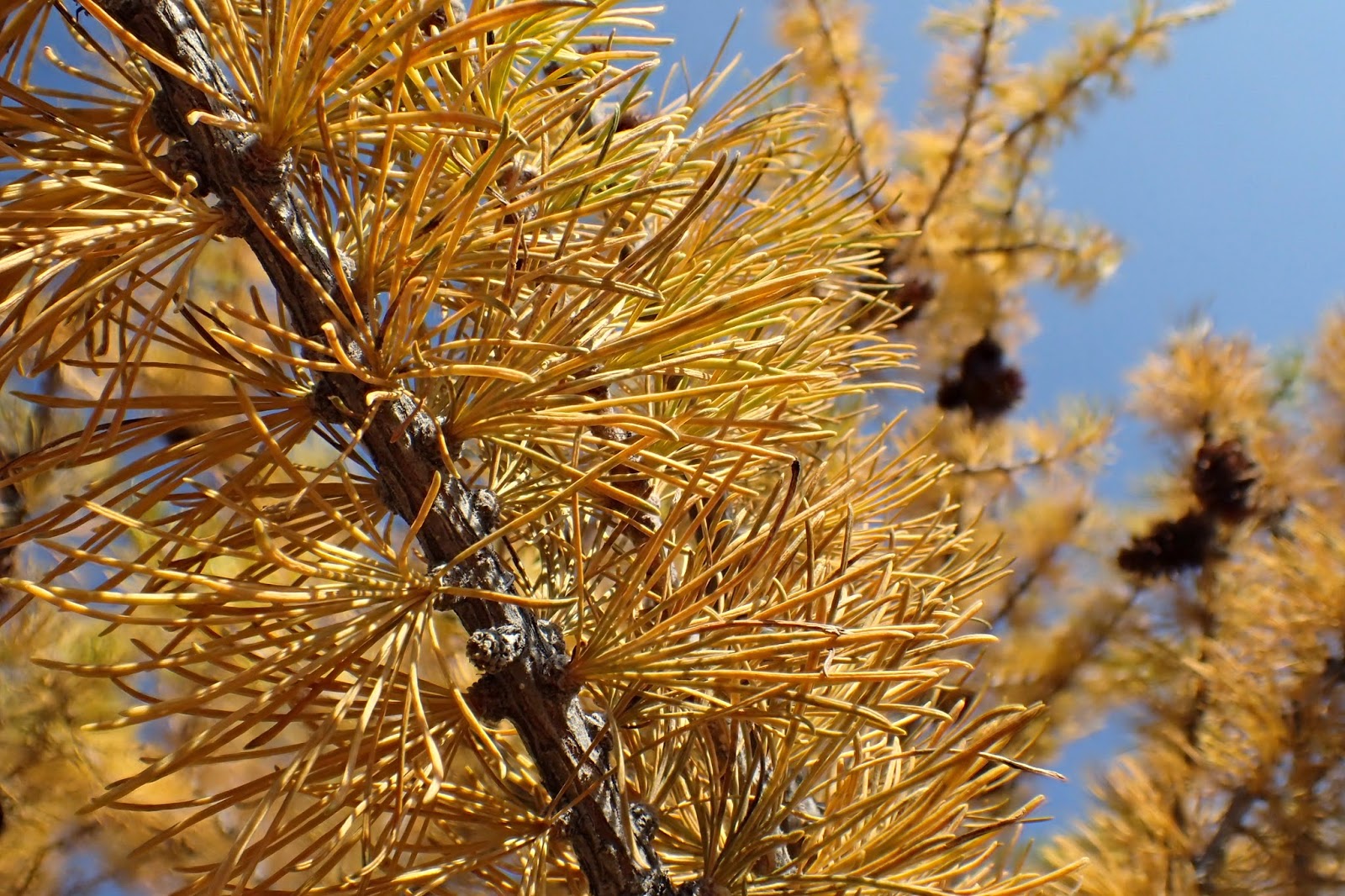 しばらくモレーンレイク沿いの山道を登ると、カラマツ・ラーチの谷が