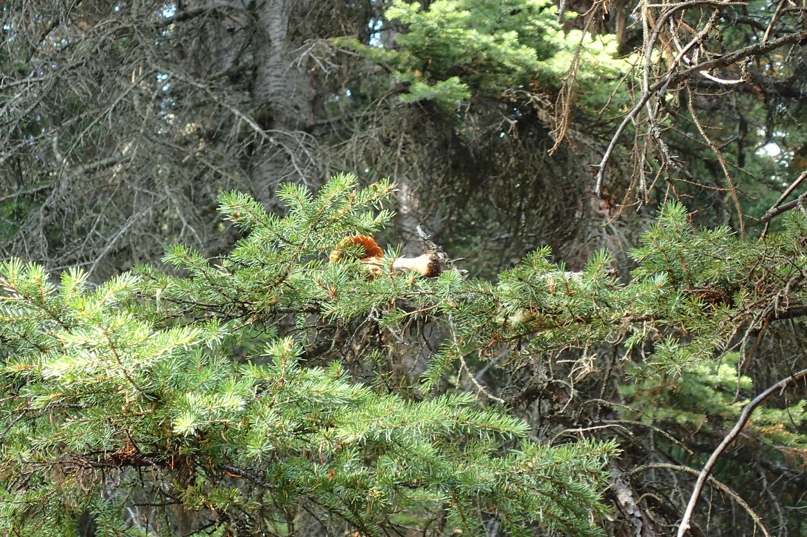 樹の枝にキノコが・・・。これは人間のイタズラじゃなくて、リスの仕業