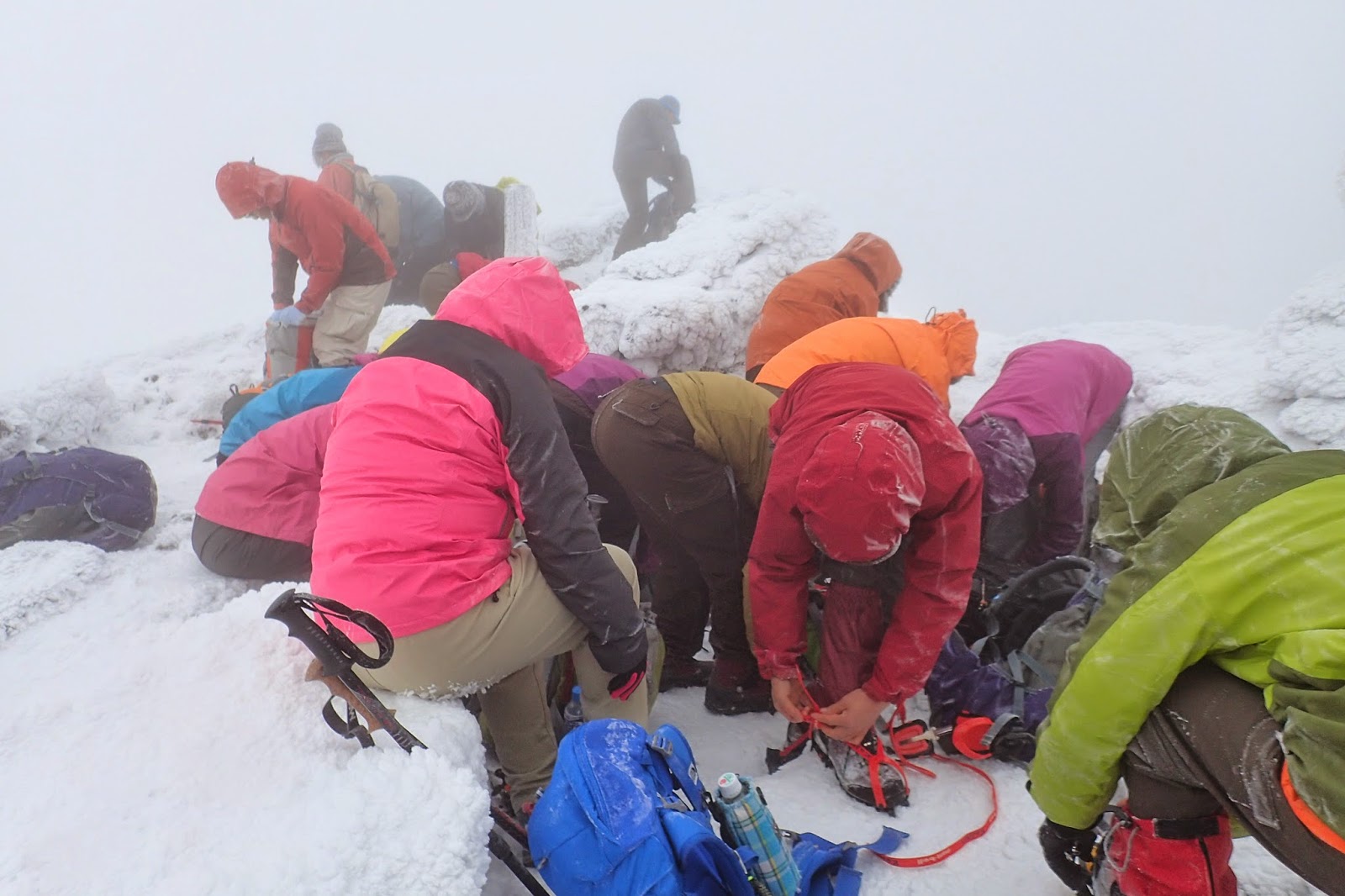 お客さんは雪山に慣れていない。半数がアイゼン使ったことないらしい(^_^;)