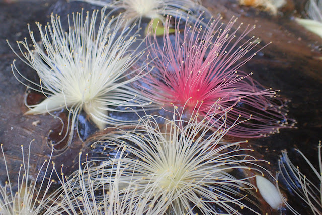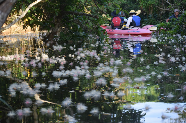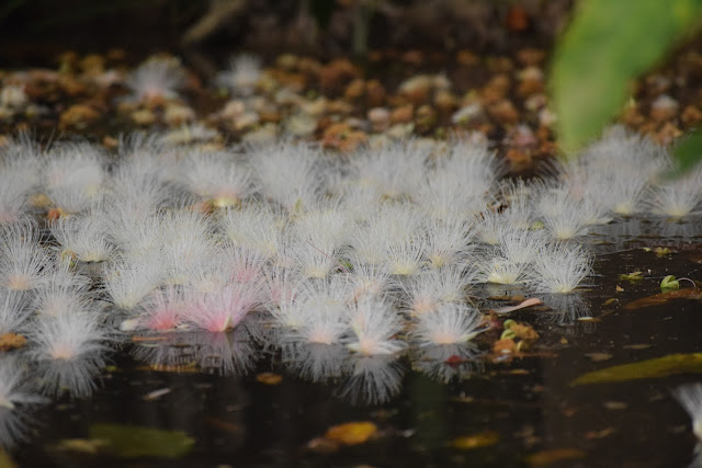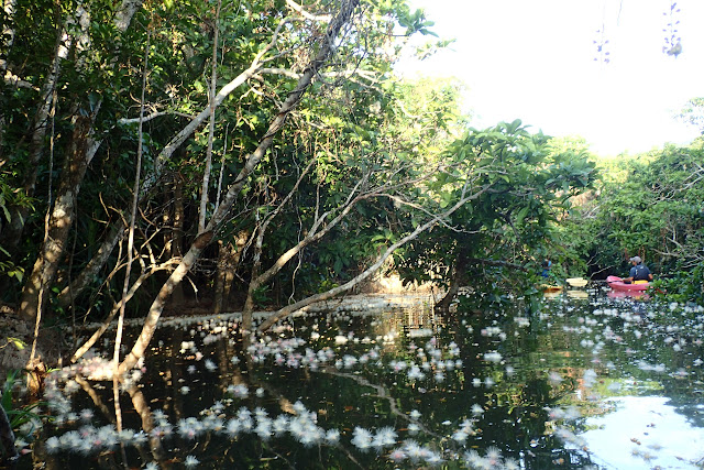 川面には散ったサガリバナが浮かび、花が残っている木からも