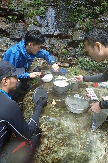 友人が着ている、モンベルの沢用ウェットスーツは薄いので、このような遊びには若干保温力不足のようです。後で調べたら0.5mm!!みんなよく頑張った!