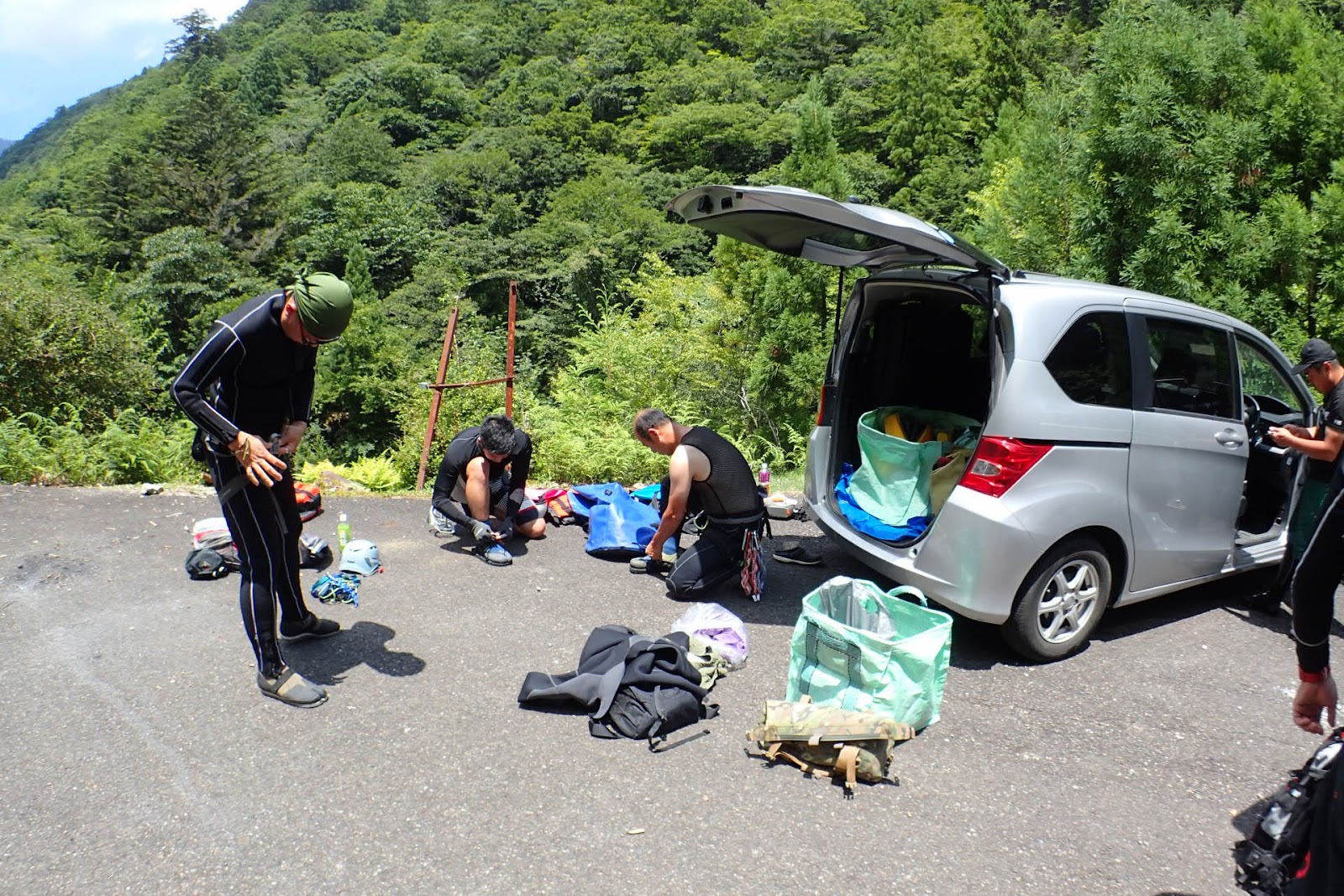 まずはウェットスーツ、沢靴などのキャニオニング装備に着替えます。