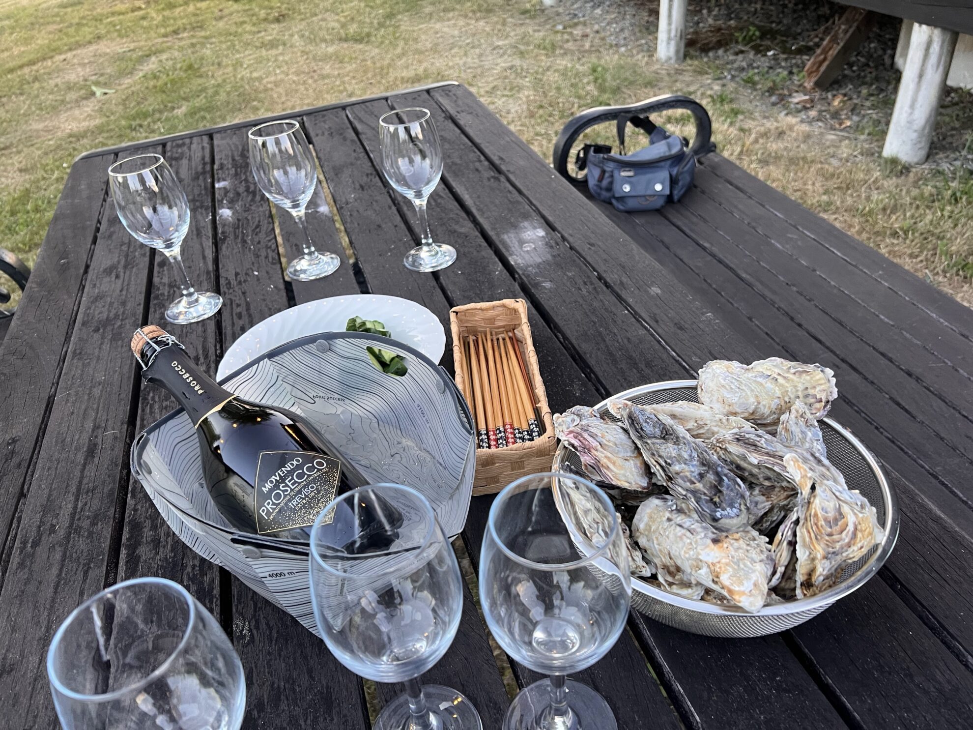 買ってきた新鮮な魚介類をセットします。厚岸の生牡蠣とセイコーマートで買ったイタリアのスパークリングワイン