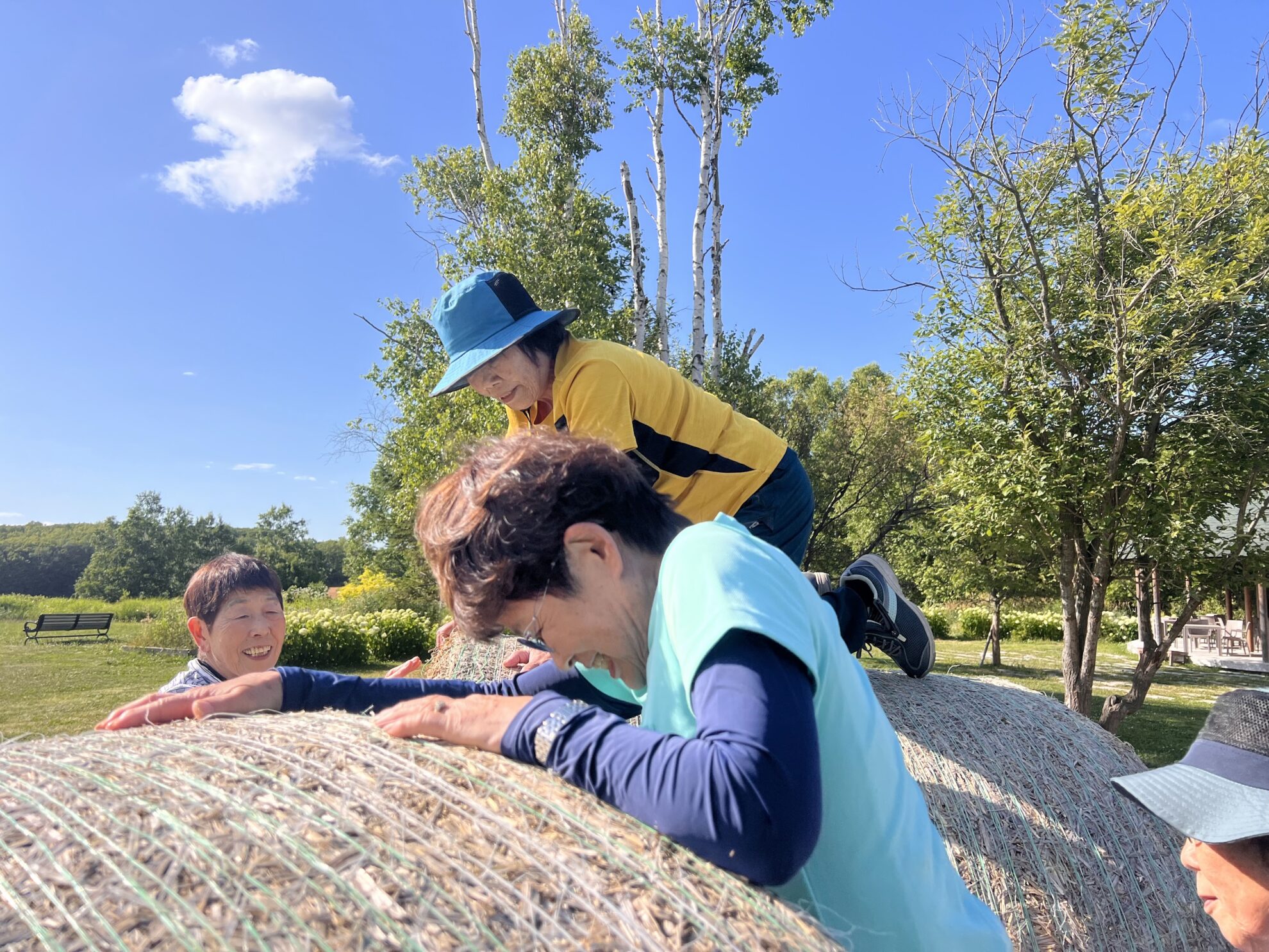 宿に戻り、設置されている麦稈ロールで遊びます。