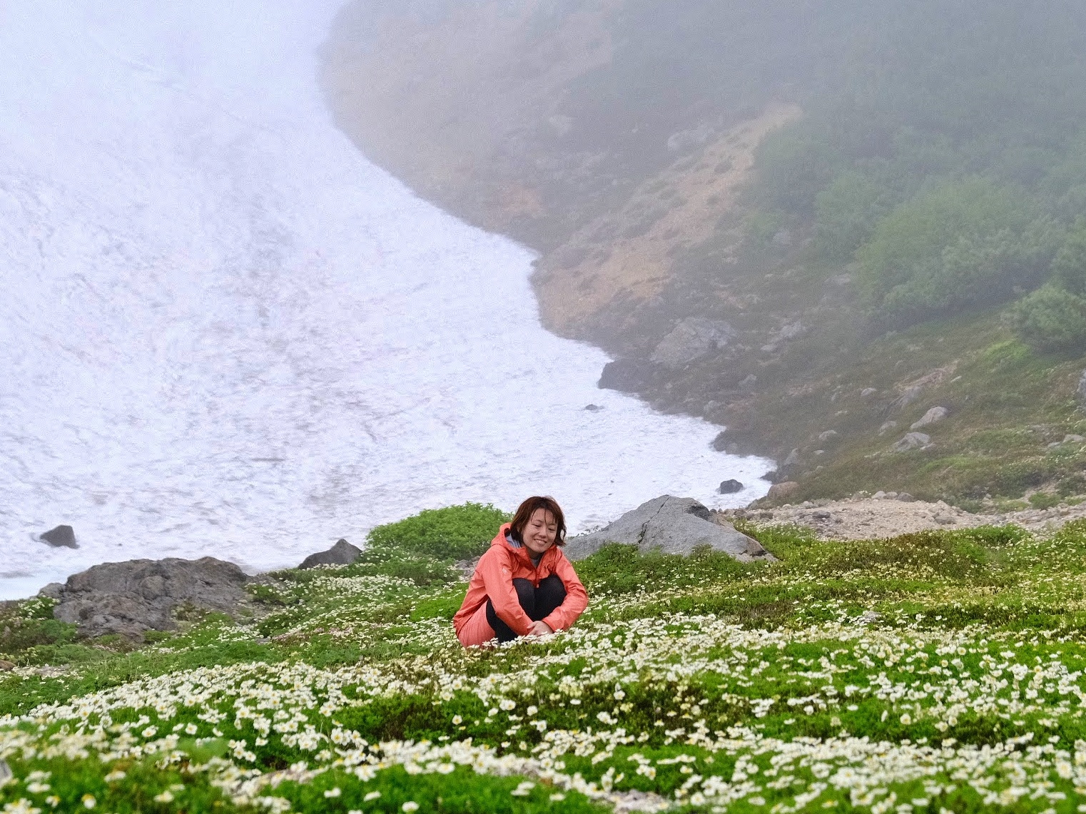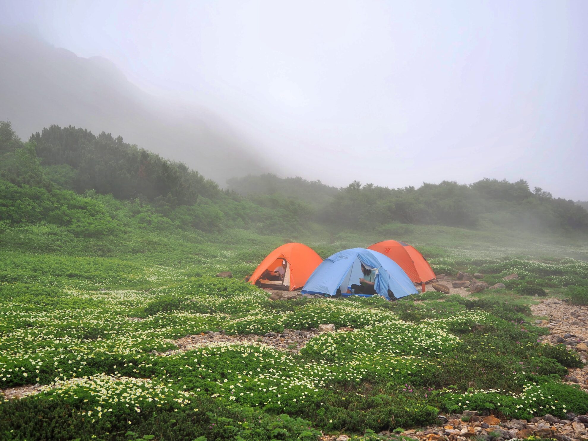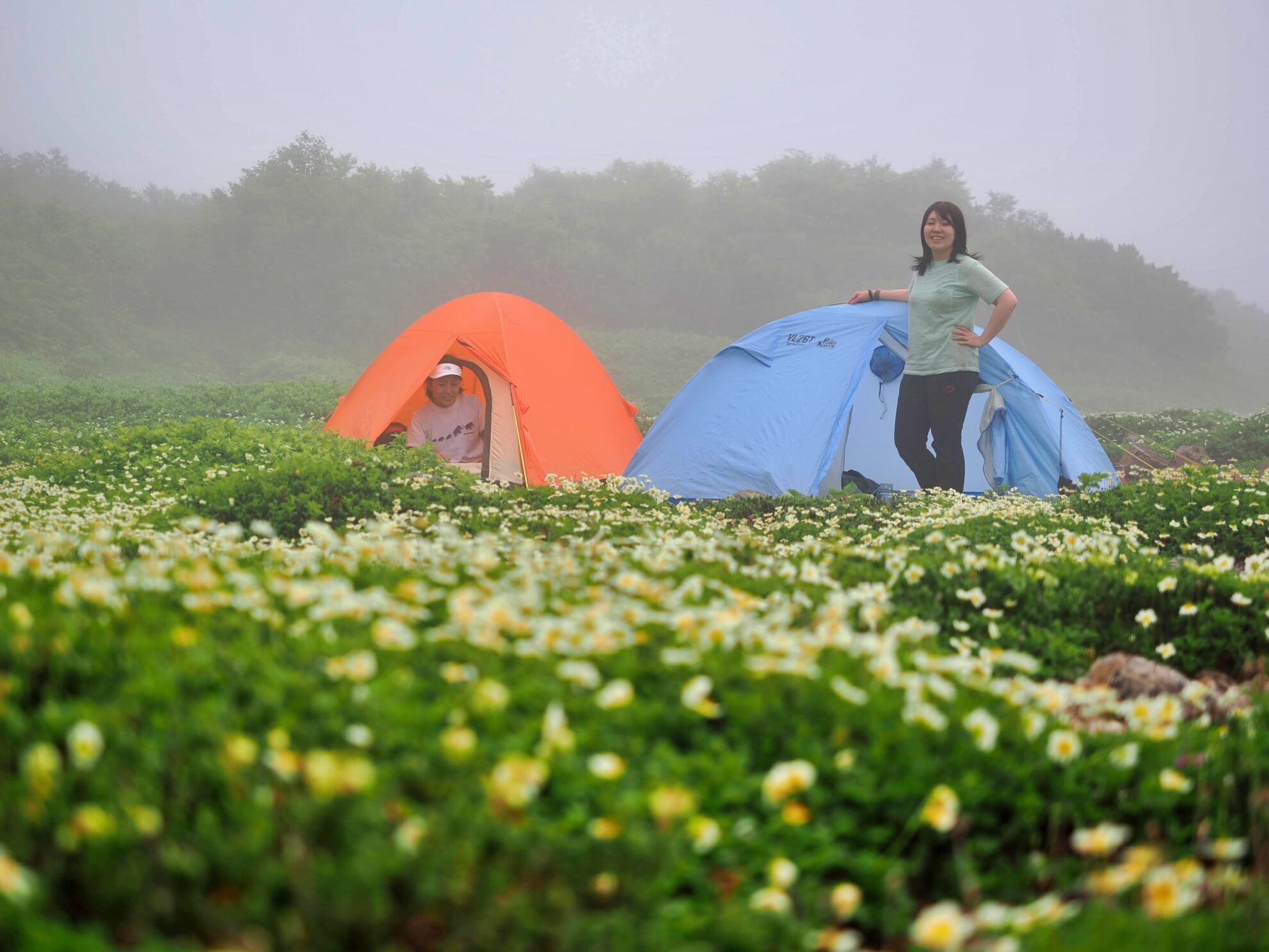 咲き誇るチングルマのお花畑の中でテントを張ります。