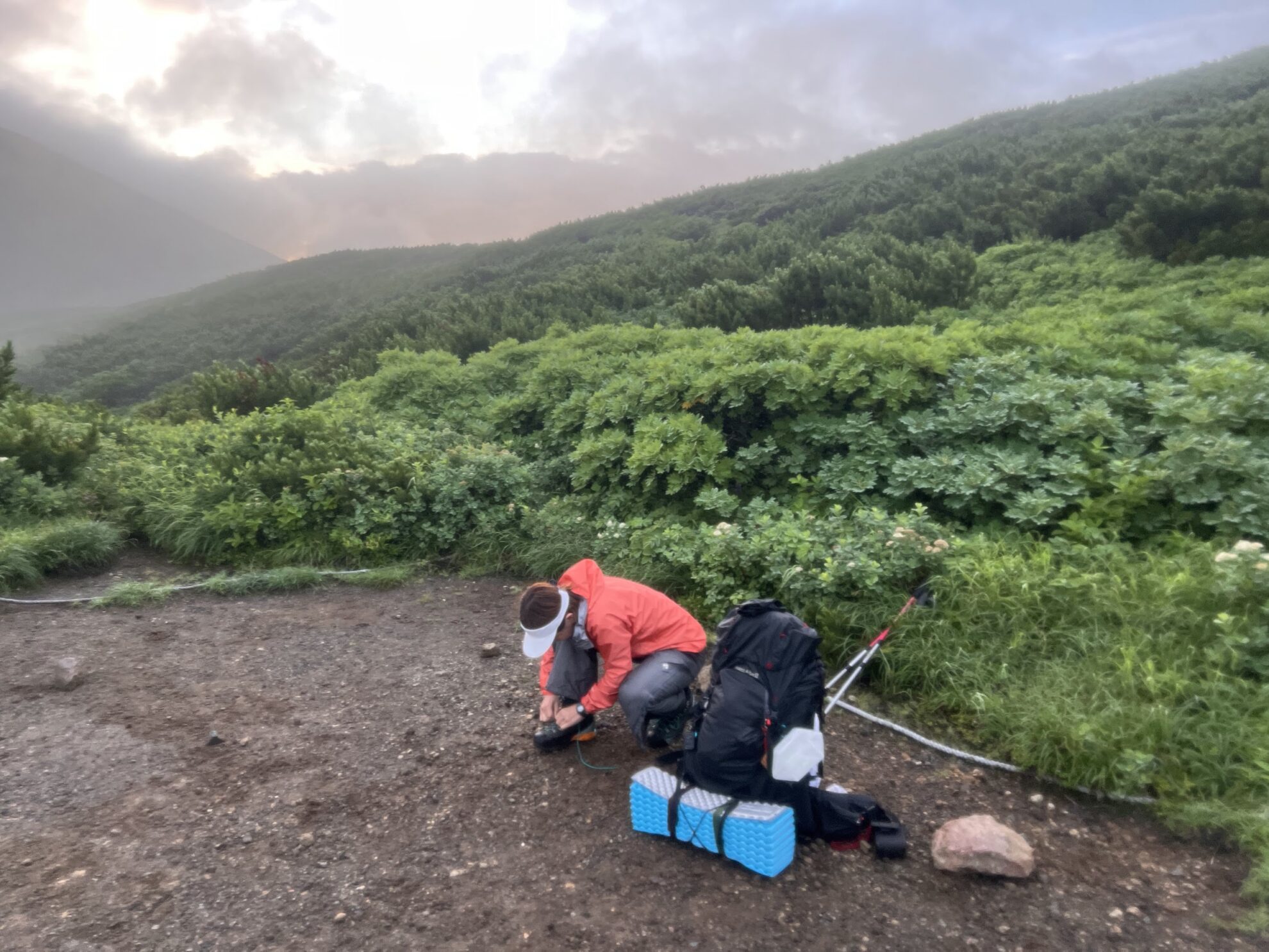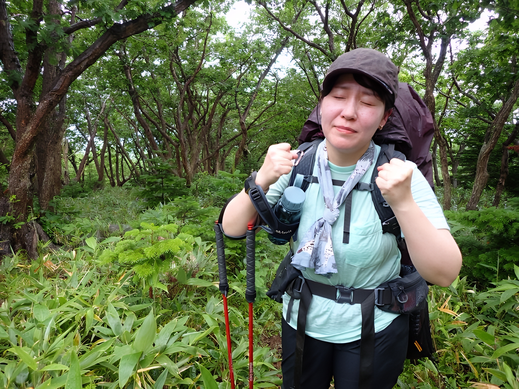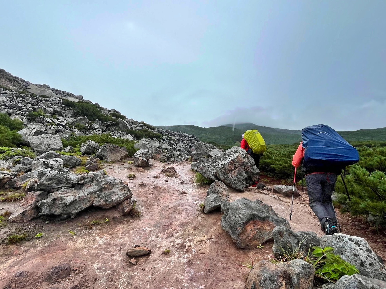 北海道といえど、登山口の標高が高くないので蒸い。テン泊装備に急登で体力が削がれていきます。