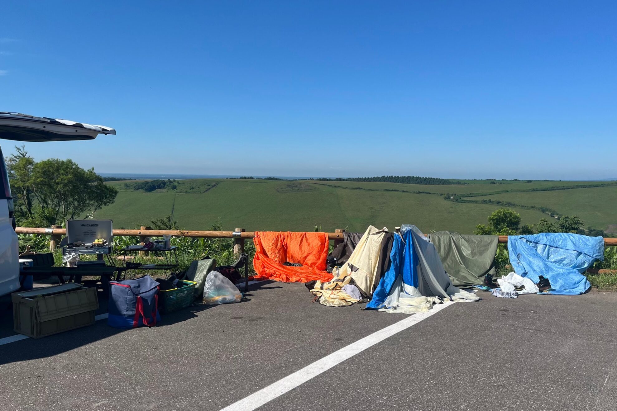まだ人の来ない某駐車場で、テントなどを乾かします。