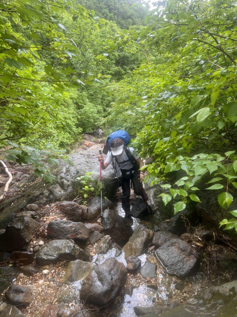 登山道が川に もちろん真ん中をバシャバシャといきます。