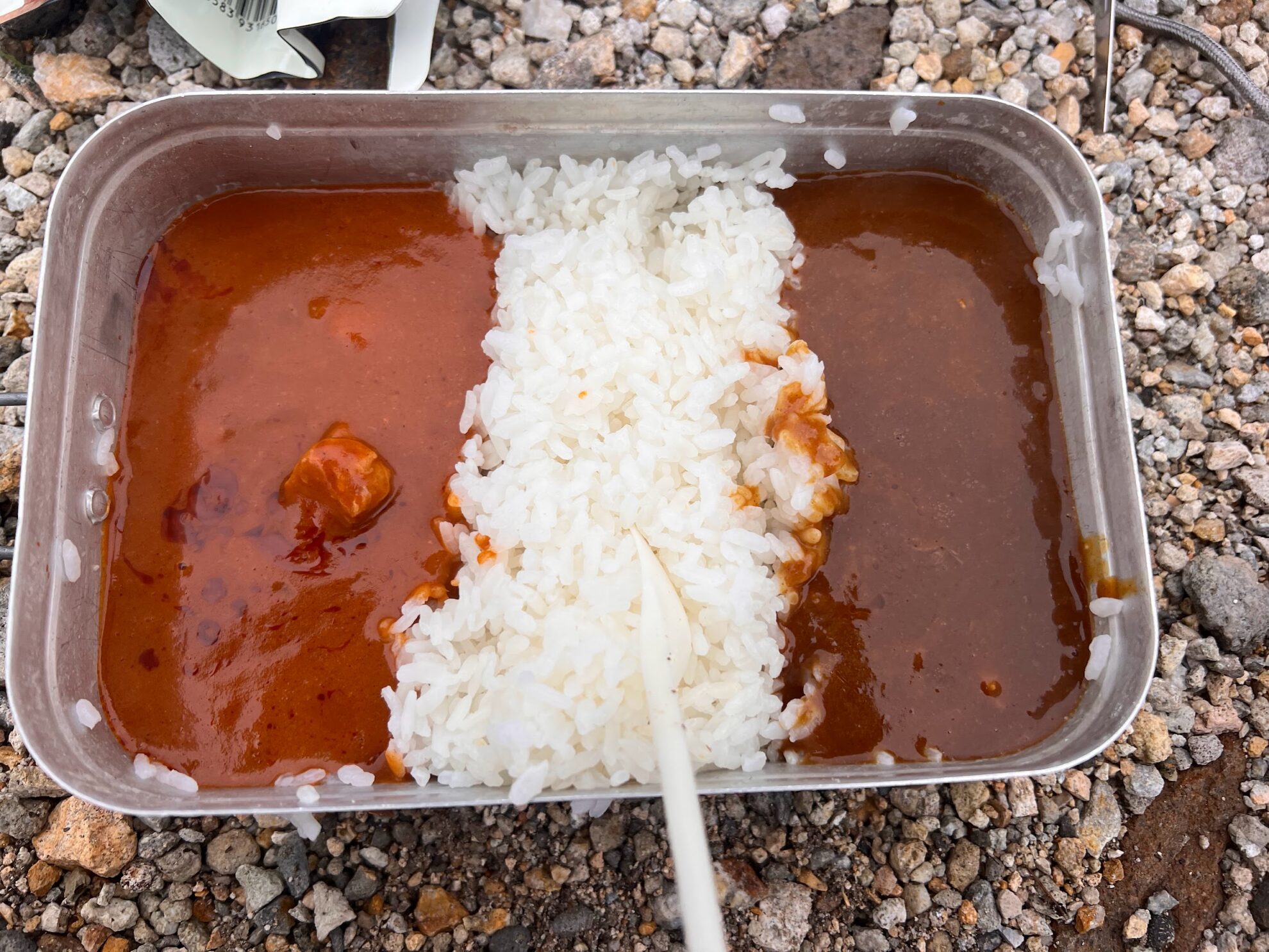 夕食はメスティンでお米を炊いてみんなでシェア。