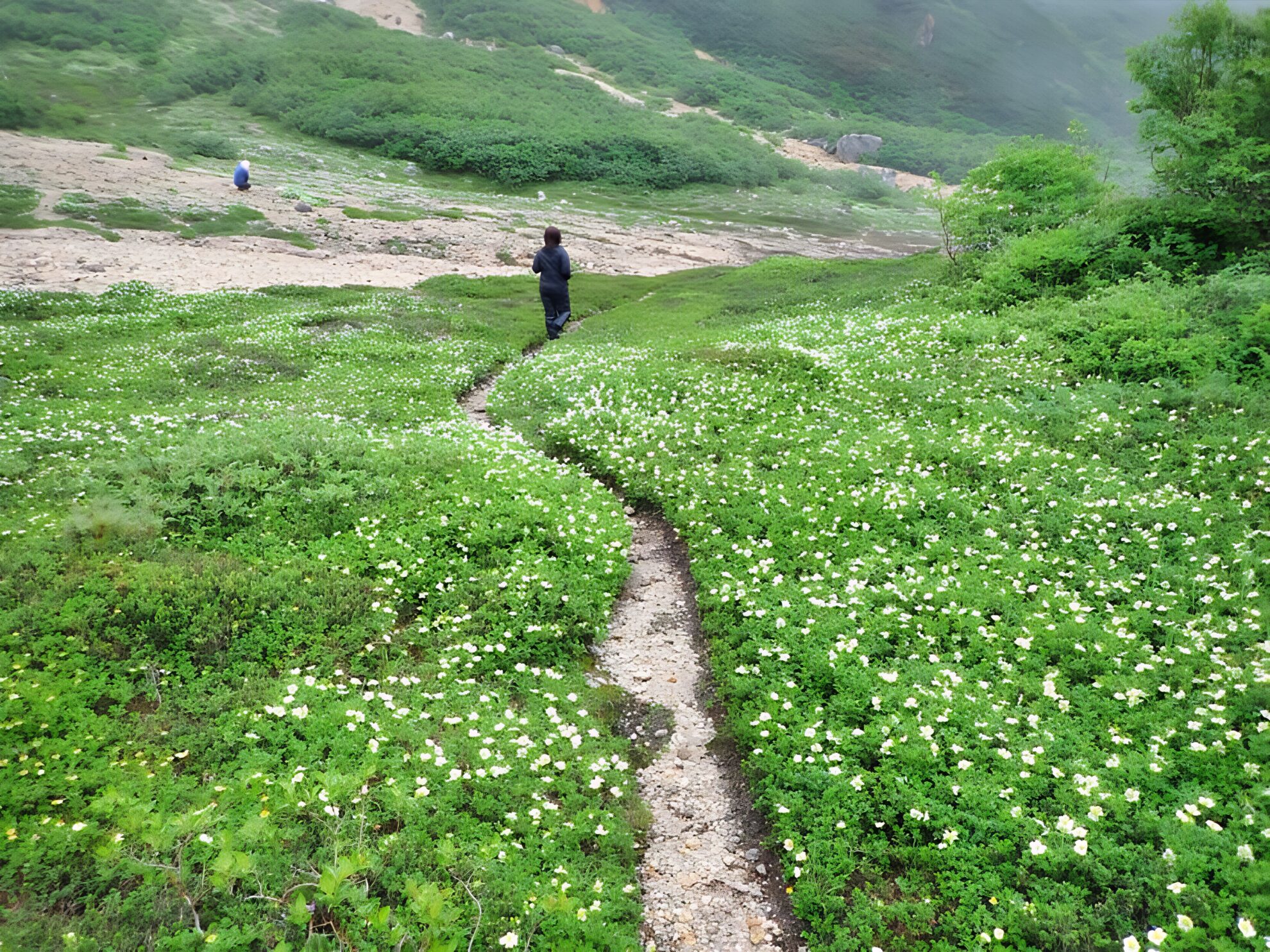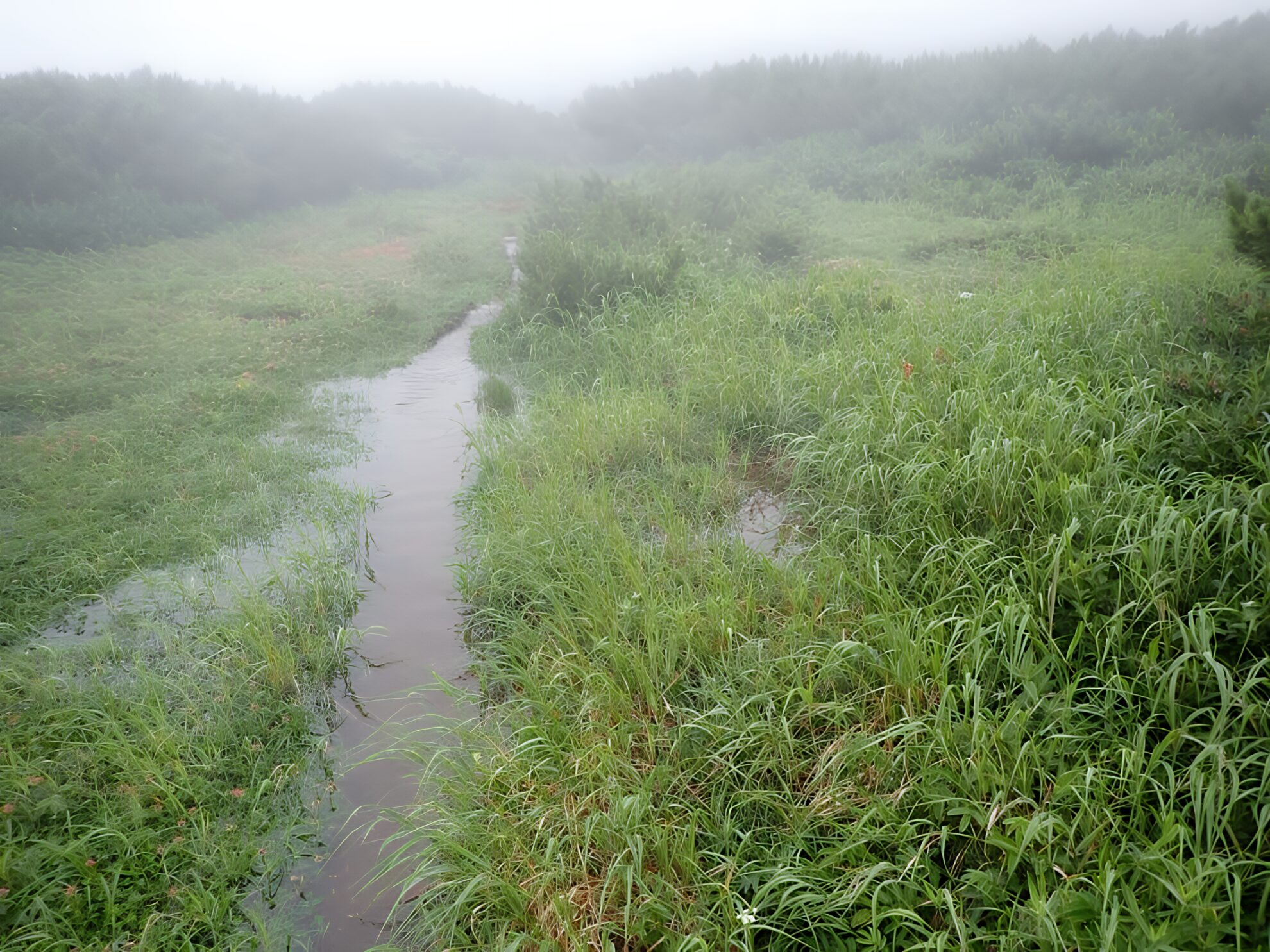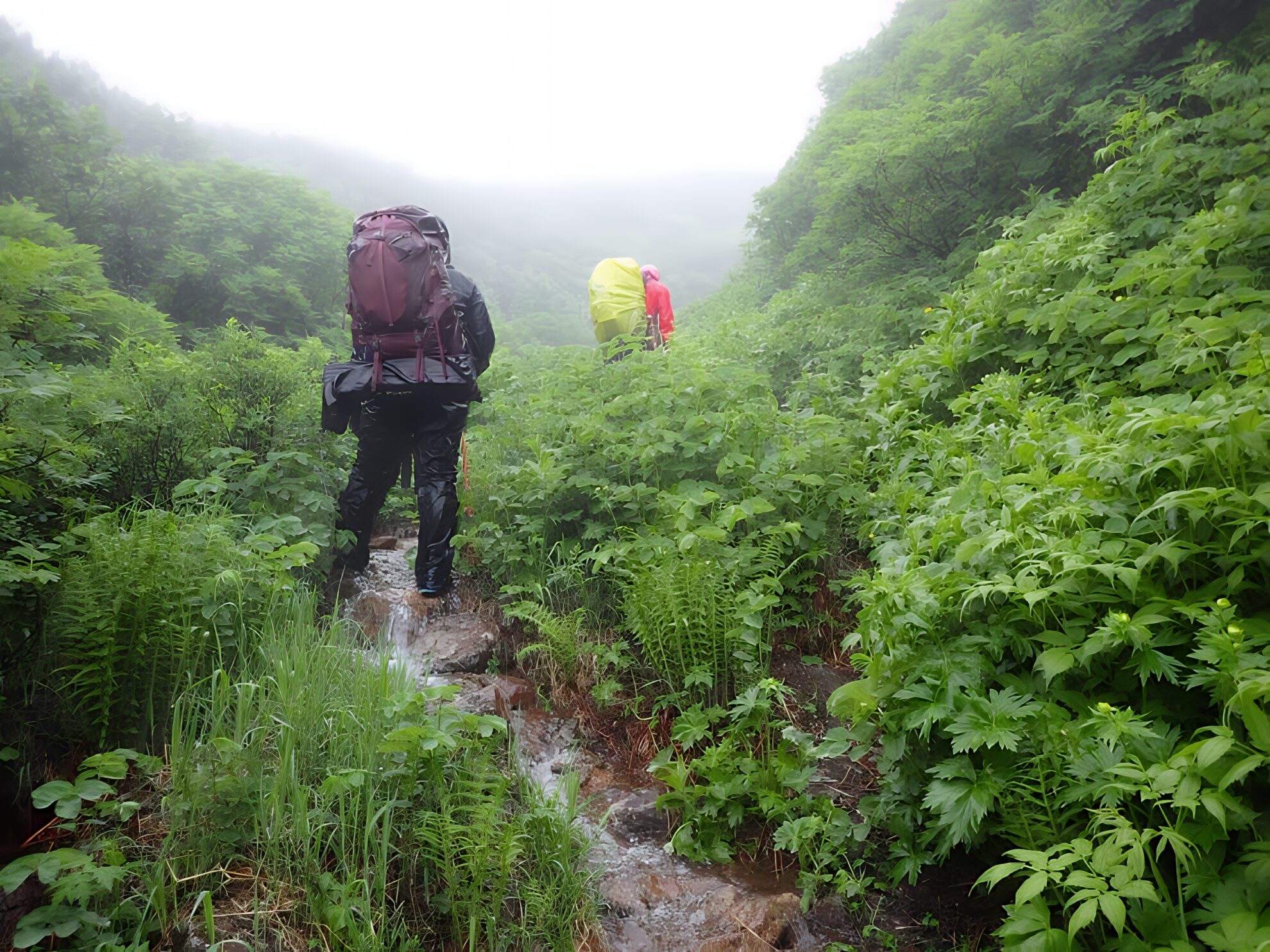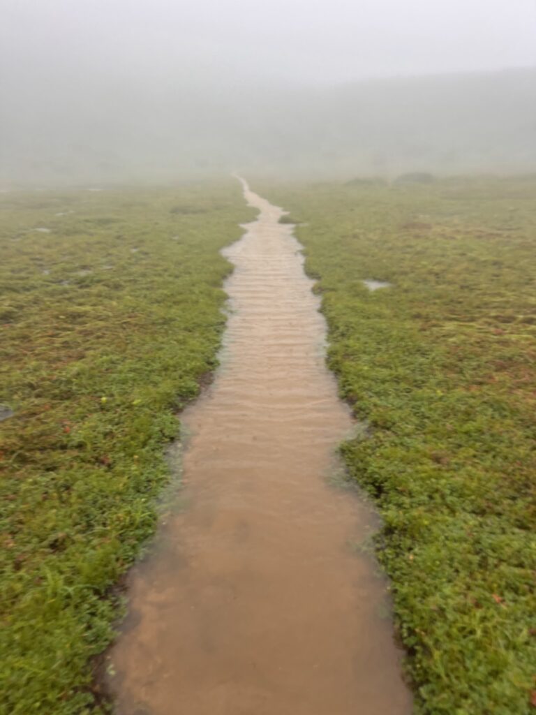 この写真を見て、気づきませんか? 普通の山なら、靴を濡らしたり汚したくない底レベルの登山者が、脇の植物を踏んで道を広げてしまします。しかし、ここではそういった景色は見られません。植物を踏んだりして登山道を広げたりするようなレベルの登山者が少ないことを意味します。水の中を歩きたいわけではありませんが、気分はいいです。