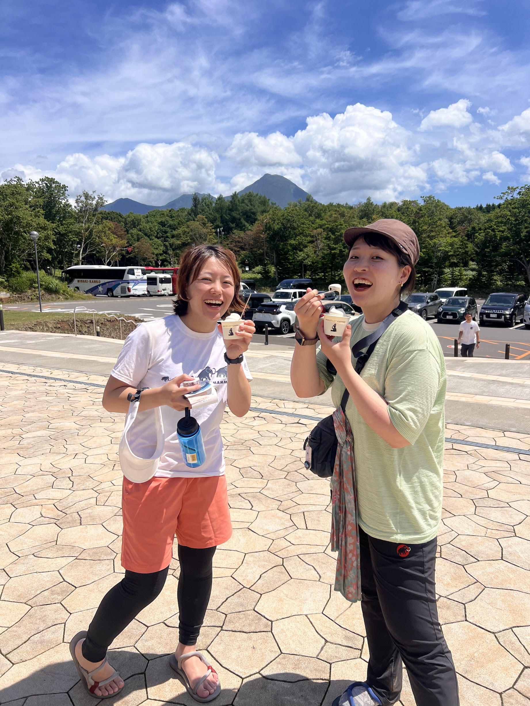 知床自然センターで、羅臼岳をバックにスイーツ補給。